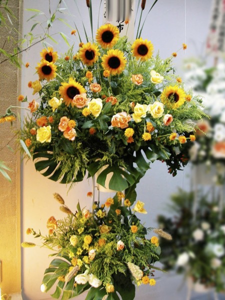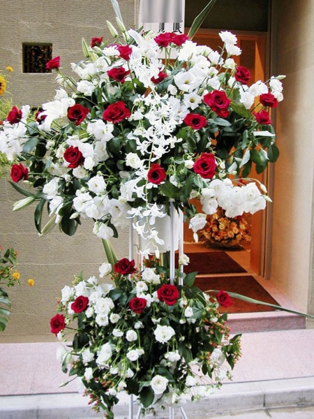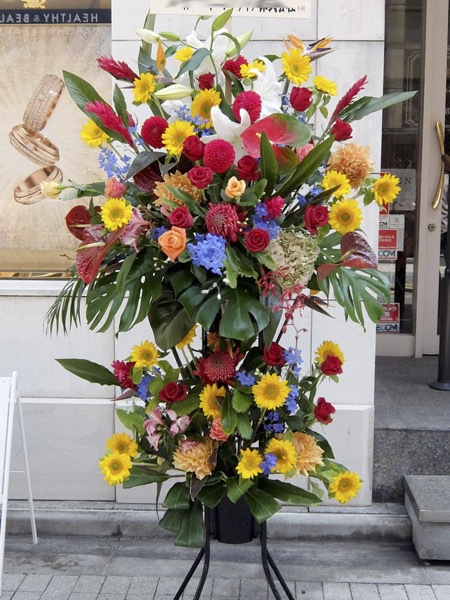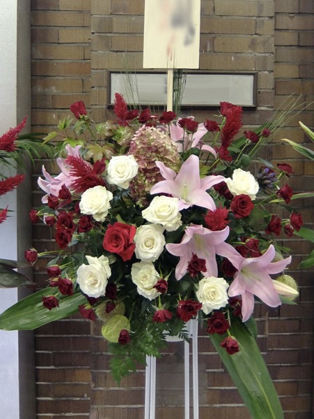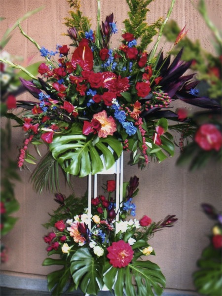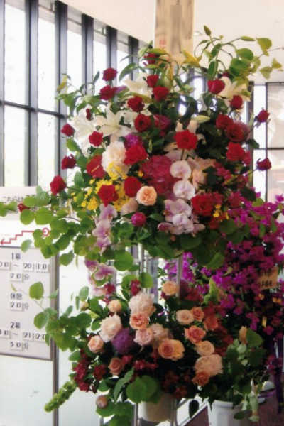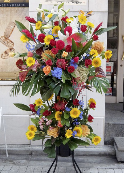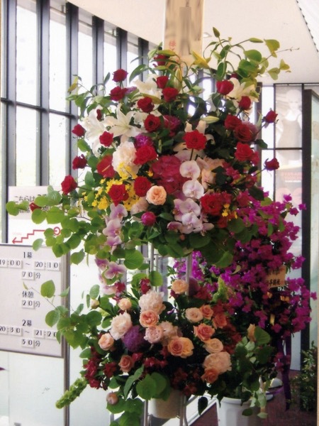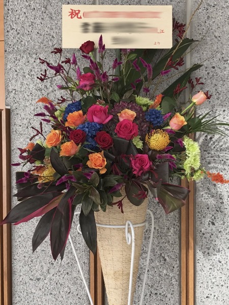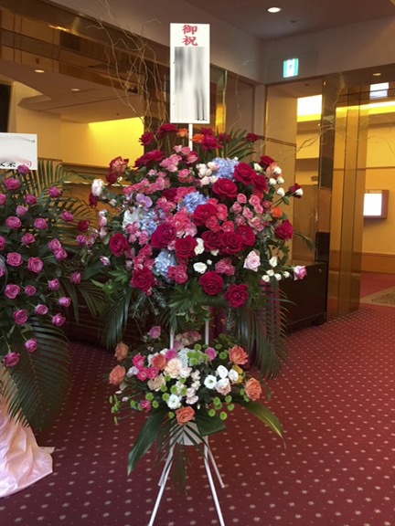 劇場・ホールでのお祝に。青プリザーブドを挿し色にして。